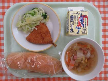 今日の献立は、コッペパン、あじフライ、ブロッコリーサラダ、ひよこ豆のスープ、牛乳です。