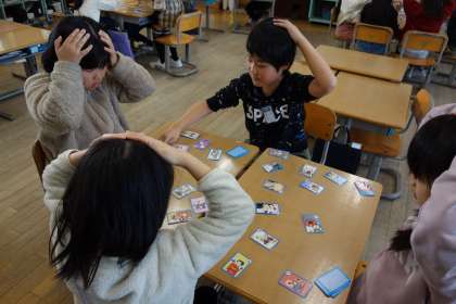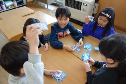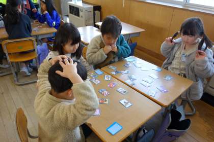 生活科で、昔から続く遊びに親しんでいる子供たち。今日は、グループで「いろはかるた」を楽しみました。