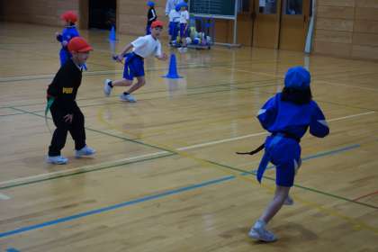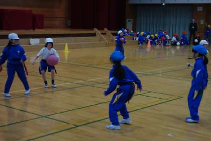 体育科の「ボール運び鬼」の学習の様子です。これまでの学習を生かし、獲得ポイントを競いました。
