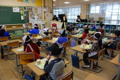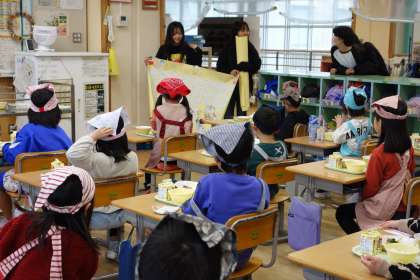 給食中、6年生がメッセージカードを届けに来てくれました。ありがとうございます。