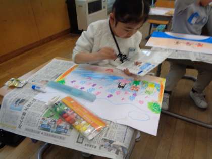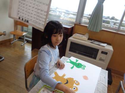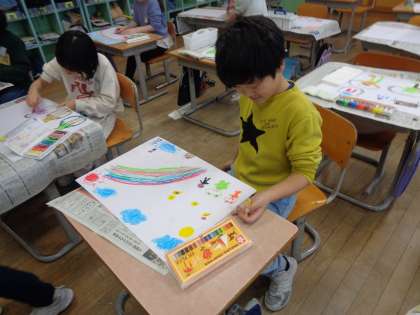 今まで学習してきた「お手紙」に出てくる、がまくんとかえるくんとどんなことがしたいか想像し、絵で表現しました。クレヨンで色を塗ってから絵の具を塗るなど、工夫して取り組んでいました。