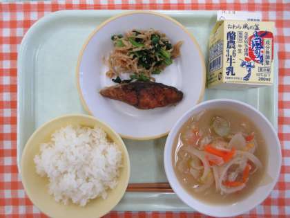 今日の献立は、ごはん、ふくらぎのかば焼き、はりはり和え、五目汁、牛乳です。