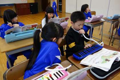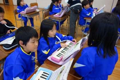 音楽科の学習の様子です。互いに演奏を聴き合い、指使いを確かめました。