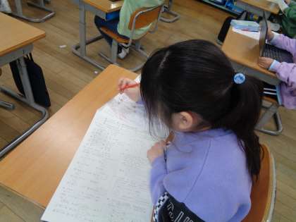 期末テストの直しをしている様子です。間違いが多かったところや、書き方で気をつけるポイントなどを聞いた後は、各自で答えをみながら直しを行っています。間違ったところを直したり、何度も繰り返し解いたりすることで定着を図っています。