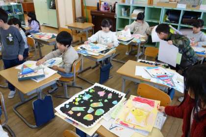 図画工作科などでつくった作品をまとめ、持ち帰る準備を行っている様子です。子供たちが一生懸命につくった作品たちです。お家でも感想を伝えてあげていただけると幸いです。
