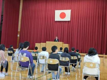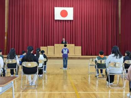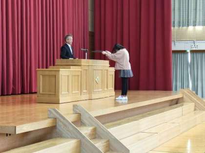 修了式に引き続き、同窓会入会式を行いました。同窓会会長様より、「宮野小学校の卒業生であることに誇りをもって人生を歩んでください」とお言葉と、記念品として「卒業証書ホルダー」をいただきました。それらを受け、代表児童が誓いの言葉を述べました。子供たちは、同窓会会員として立派に過ごしていこうという気持ちを高めていました。