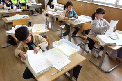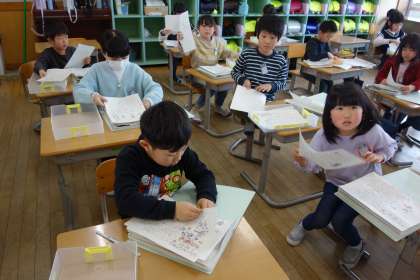 学習で使った様々なプリントを一つ一つ確かめながら、ファイルに綴りました。過去のプリントを懐かしむ姿が見られたり、分厚いファイルを見て、これまでの成長を実感しました。