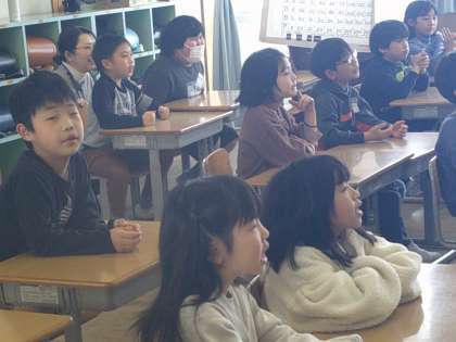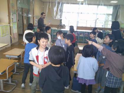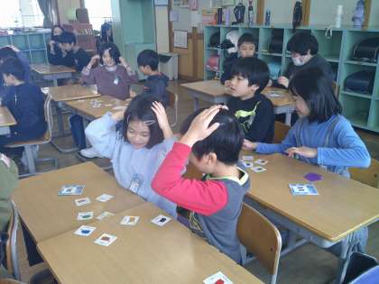 子供たちが楽しみにしていた外国語活動。色と単語をかいたカードを、ALTの発音に合わせてとったり、気持ちを表す言い方を使ってゲームをしたり、大盛り上がりでした。
