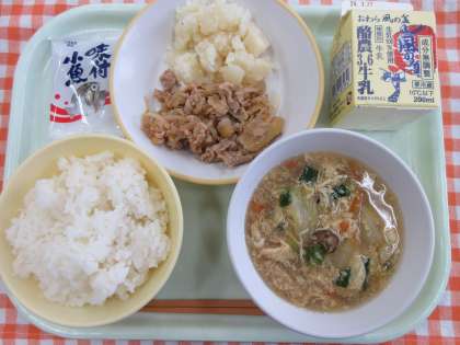 今日の献立は、ごはん、豚肉のキムチ炒め、こふきいも、中華かきたま汁、味付け小魚、牛乳です。