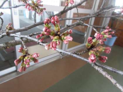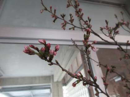 校内に桜の枝が飾られています。桜のつぼみが膨らみ、花も咲き始めました。