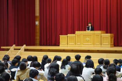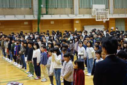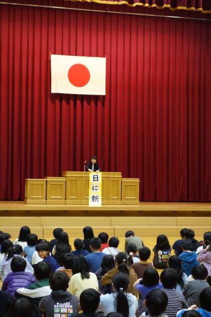 新しく着任された校長先生のお話を聞く、宮野っ子の様子です。「日に新」という言葉にまつわるお話をいただき、一日一日を大切に過ごして自分を磨いていこうと気持ちを高めました。