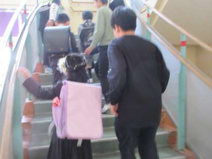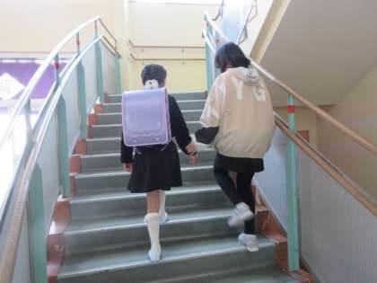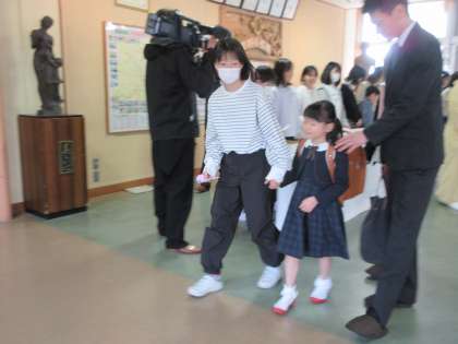 6年生が1年生を優しく教室まで案内しています。1年生は安心ですね。