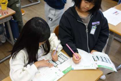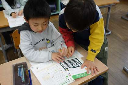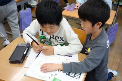 2年生の新しい教科書を使って、算数の学習を進めています。必要に応じて、友達同士で教え合って学習を進めました。