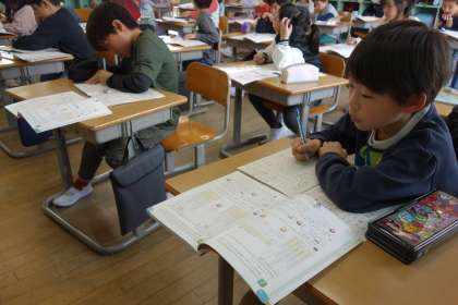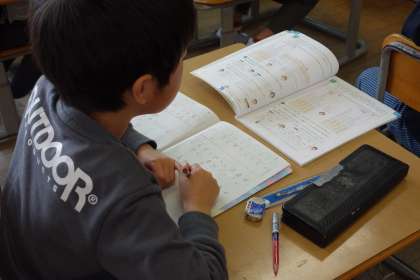 教科書にある二つのグラフを見比べて、増えたものと減ったものを確かめています。じっくり見て、ノートに記しました。