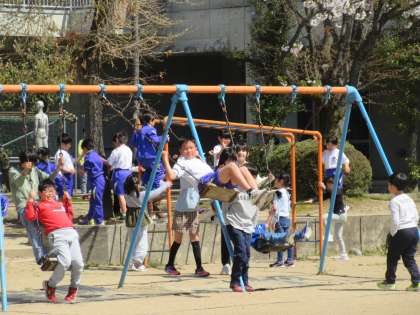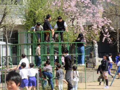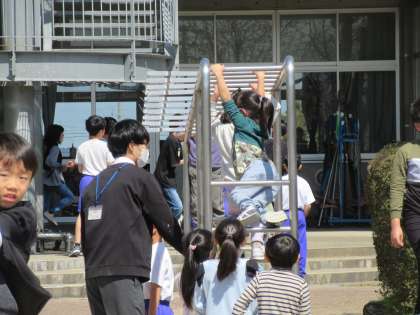 大勢の子供たちが外に出て、活動を楽しんでいます。