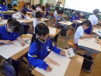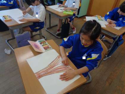 図工の学習では、次回桜の木をスケッチするために、木の幹を描く練習を行いました。描くポイントは、一本ずつ線のように色を埋めていくこと。木の幹の色に近い色や出したい雰囲気を考えながら色を選び、描いていました。