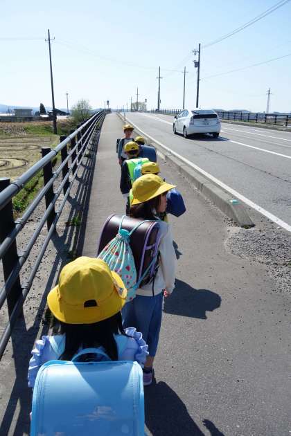 2年生の児童が、1年生を先導しながら下校しています。時折振り返りながら、1年生のペースに合わせながら下校をしています。進級し、頼もしさが感じられる場面がたくさん見られます。