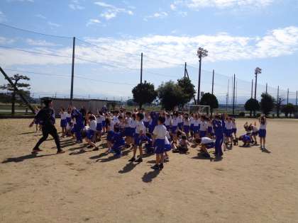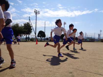 3・4年生合同で体育の授業をしました。青空の下、全力で50mを駆け抜けました。