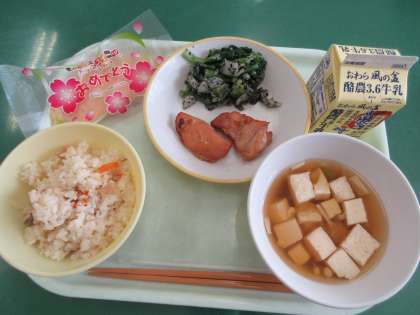 メニューは、ちらしずし、鶏肉の照り焼き、よごし、すまし汁、お祝いデザート、牛乳でした。入学や進級のうれしいお祝い給食で、甘いクレープが待ち遠しかったですね。