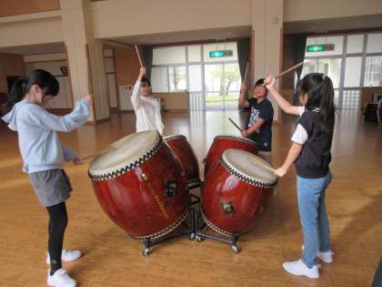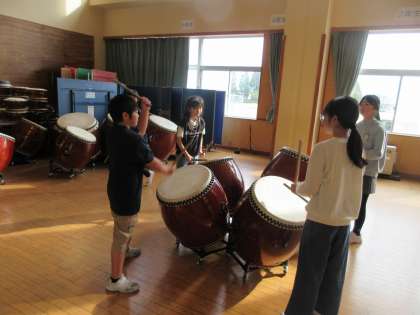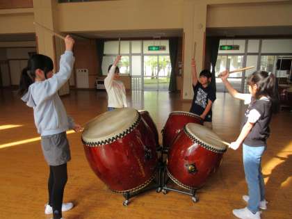 太鼓の響く音が聞こえてきました。昨年の6年生から引き継ぎ、自主練習を行っています。元気いっぱいの素晴らしい技を見せてもらいました。