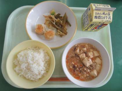 メニューは、ご飯、にんじんシューマイ、茎わかめのチョナムル、麻婆豆腐、牛乳でした。野菜が細かく刻まれていて、とても食べやすいです。