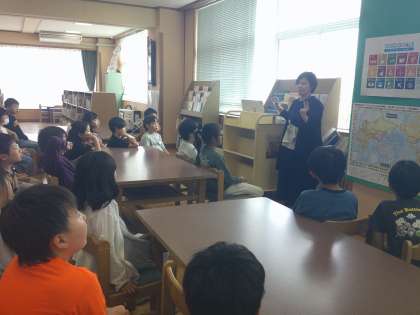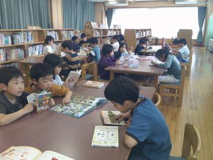学校司書教諭の先生から、図書室のきまりを教えていただき、読み聞かせをしていただきました。