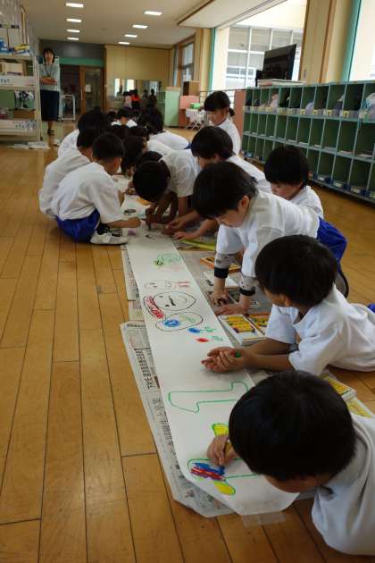 ながーい紙にクラスの友達みんなで絵を描きました。作品は1年ワークに掲示しました。学習参観の折にご覧ください。