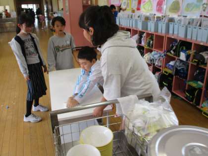 力を合わせて給食の片付けをしています。 きれいにできました。