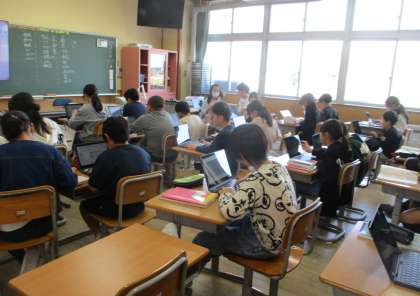 クロームブックを使って、自分の考えを書きます。 集中して取り組んでいます。