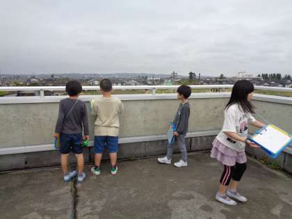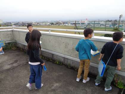 宮野小学校の周りには何があるのかを屋上から見ました。 たくさんの建物があることが分かりました。