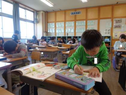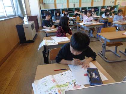 国語の学習では、春だなあと感じるものを見つけて文章を描きました。「つくし」や「たんぽぽ」「てんとうむし」などいろいろなものから春を感じ、文章を作ることができました。