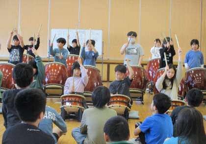 5年生になってはじめて、みんなで太鼓の演奏をやってみました。 まずは「大地」チームです。