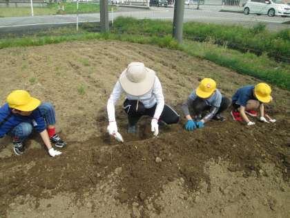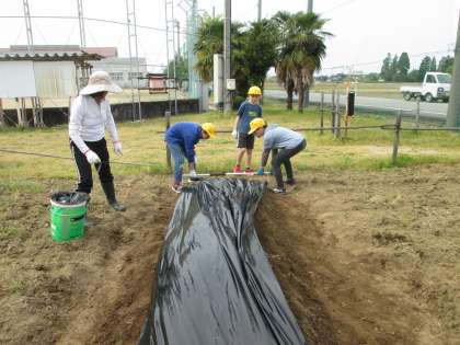 協力して畝を作り、シートをかぶせる作業をしました。「ここ手伝って」「まかせて」などの声かけが素敵でした。来週はじゃがいもを植えます。