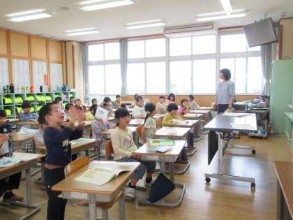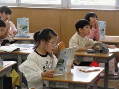 気付いたことを身振り手振りでお話ししています。また、じっくりと読み味わってお話を楽しんでいます。