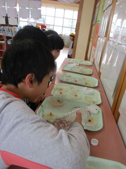 連休明けの朝、発芽の伸び具合に子供たちは驚いていました。 どこまで大きくなるのかな?