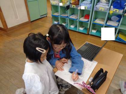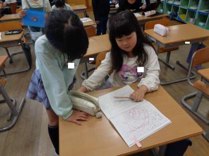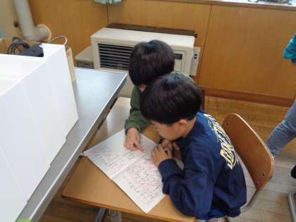 算数の学習の様子です。以前、ノートに取り組んだ問題の直しを行っています。友達に解き方を教えたり教えられたりしながら学習に取り組んでいます。