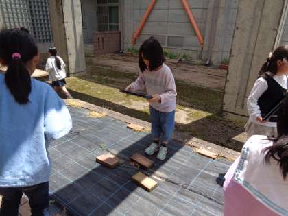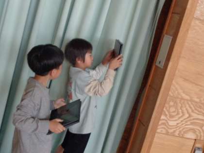図工の学習では、学校を回って顔に見えるものを探しました。宮野小学校の建物や、水道の蛇口など、いろいろなところから顔を見つけてきました。発想力の豊かな子供たちでした。
