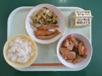 メニューは、ご飯、わかさぎのフリッター、水菜のサラダ、関東炊き、牛乳でした。フリッターは焼いてあるのですが、まるで油で揚げてあるかのようなさくさく感を味わえました。