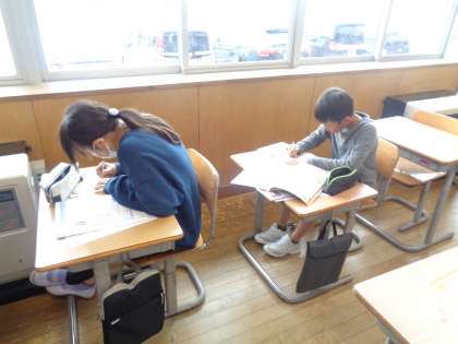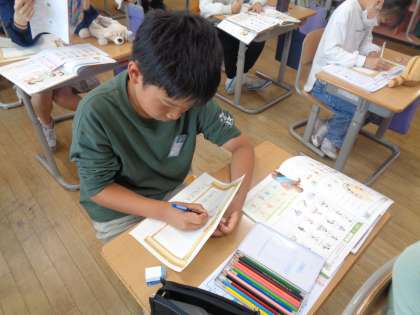 外国語の学習を行いました。自分の宝物を考え、英語で表しました。理由も考えて、英語で表そうとするなど、伝わりやすいように工夫していました。