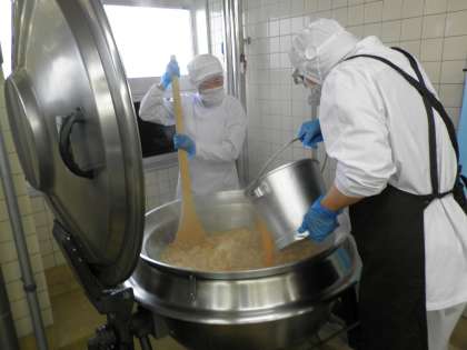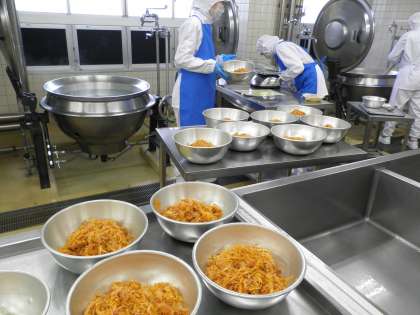 「たまごとじ」には、たくさんの卵(全校分で約20kg。小さめの卵350個ほど)が使われています。調理員さんは、新鮮なたまごかどうかを確認しながら、一個ずつていねいに割って、よく混ぜてから、釜の中に入れていきます。2人で息をあわせて仕上げていきます。