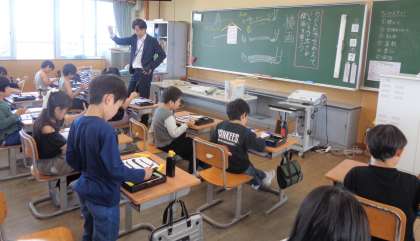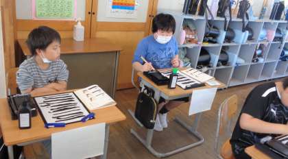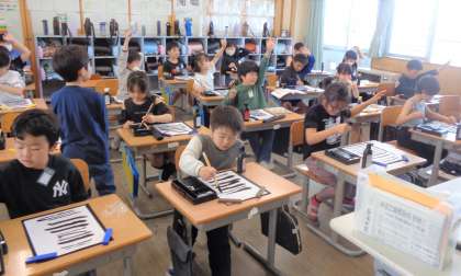 初めて習字の学習を行いました。力の入れ方を変えて、いろいろな太さの線を書きました。