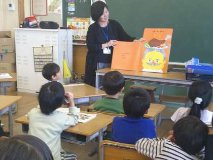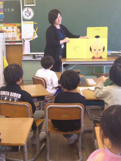 図書室より、学校司書の先生が読み聞かせに来てくださいました。子供たちは、大きな絵本を食い入るように見ていました。