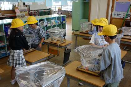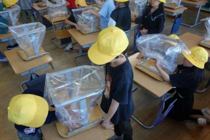 明日の予行に向けて、椅子にビニール袋を取り付けました。助け合いながら取り付ける姿がとても素敵です。