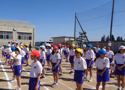 80m走のため、走順に並ぶ5年生の様子です。ラジオ体操が終わってすぐに並ぶことができました!
