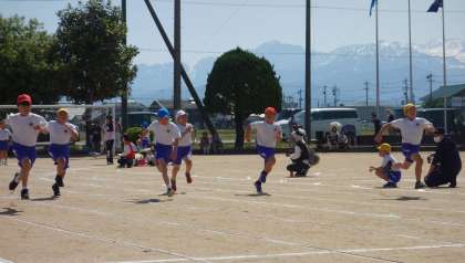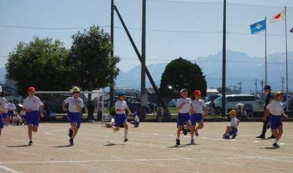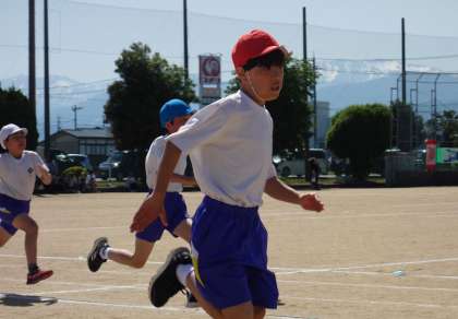 80m走を走る5年生の様子です。全員、自分の力を出し切って走ることができました。