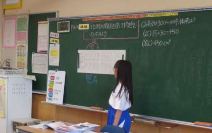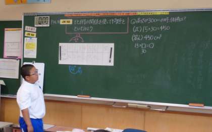算数の比例について学ぶ授業で、クラスのみんなに解き方を伝えている様子です。