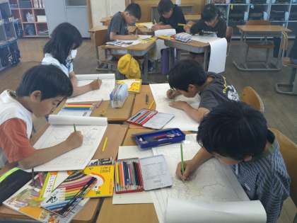 大きな川や鉄道、道路、土地の利用の様子などを白地図の作業をしながら学んでいます。
