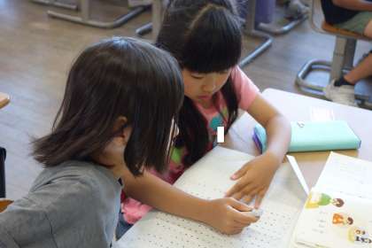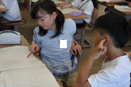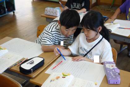 日記の学習をしています。モデル文を見ながら、「したこと」と「思ったこと」の区別をしました。ペアの友達と確かめ合いながら、学習を進めました。