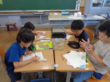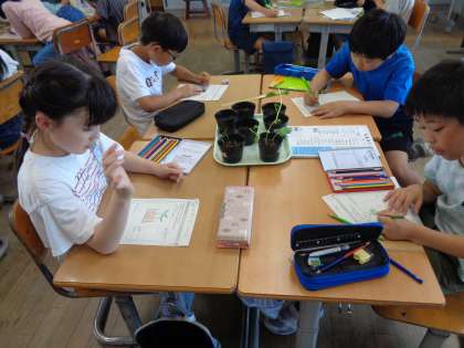 チョウや植物の観察をしました。細かい部分までよく見たり、ものさしを当てて長さを測ったりしていました。