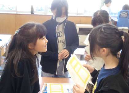 外国語の授業で友達と英語で交流している様子です。多くの友達と楽しく会話していました。